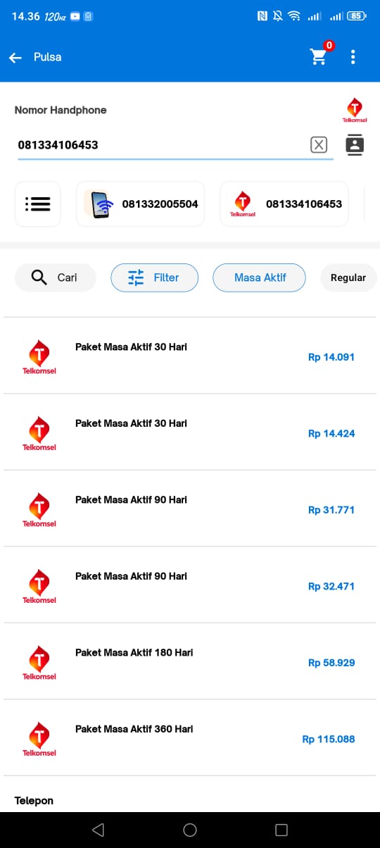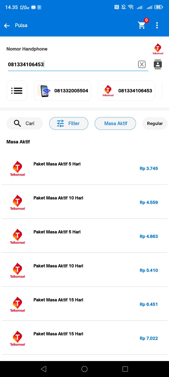 Pilih operator Telkomsel, lalu masukkan nomor yang ingin diperpanjang masa aktifnya.Pilih Kategori “Masa Aktif”