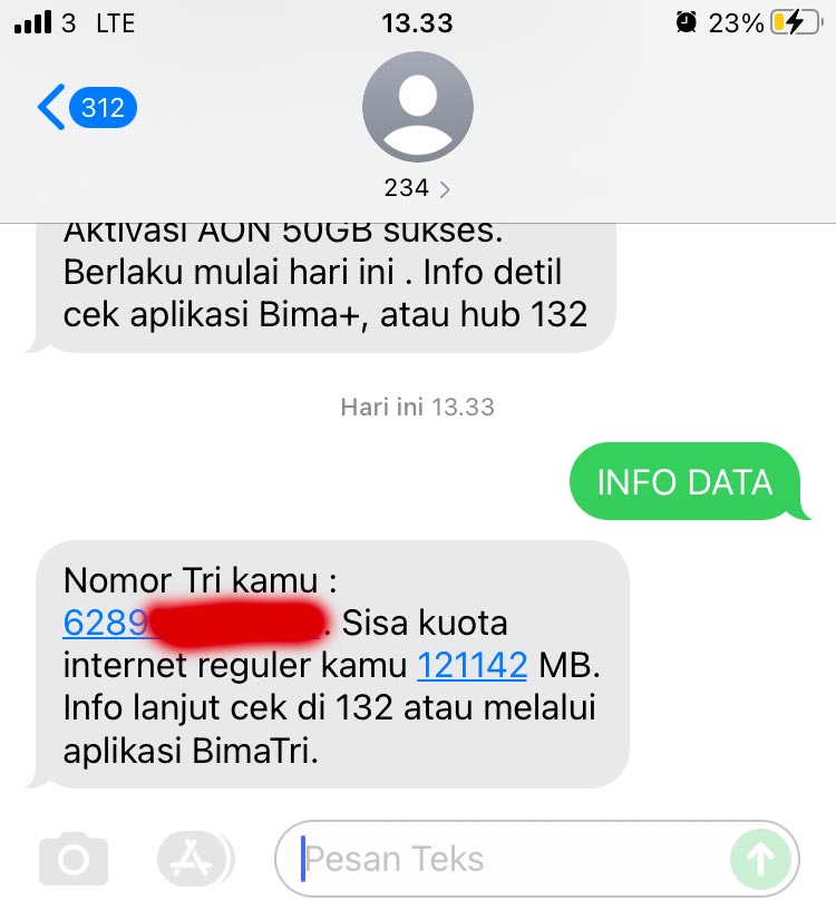 Setelah itu, Anda akan mendapatkan SMS balasan yang berisi informasi mengenai nomor Tri yang digunakan, sisa kuota data internet, dan informasi lainnya, seperti gambar berikut: