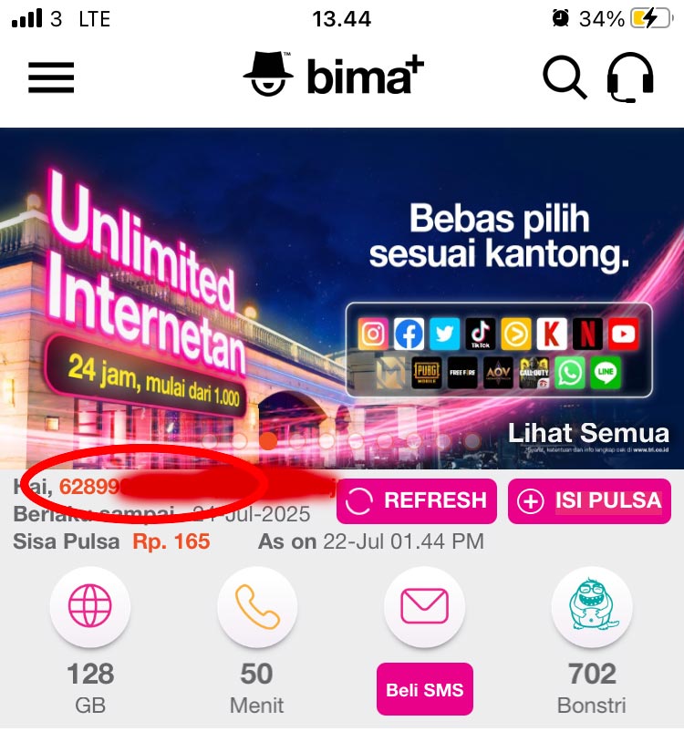 4. Cara Cek Nomor Tri Via Aplikasi Bima+