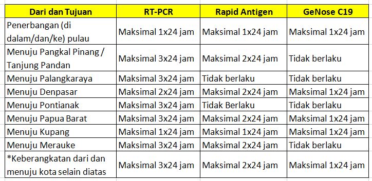 Untuk lebih jelasnya, anda bisa melihat rincian tabel dibawah ini mengenai tujuan, dan dokumen keterangan bebas Covid-19 sebagai prosedur naik pesawat domestik.